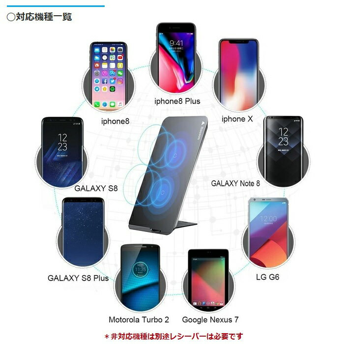 【広い交換性】多機種対応:iPhone X/iPhone 8/iPhone 8 Plus;Galaxy S8/S8 Plus/S7/S7 edge/S6/S6 edge/S6 edge Plus/note 5/note 7;Nexus 4/5/6/ Xperia等Qi対応機種 (Qiが付属していない機種は別途レシーバーが必要です。