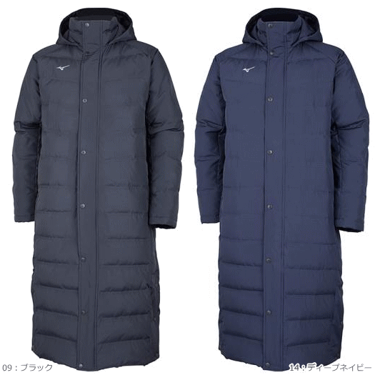 MIZUNO[ミズノ]ソフトテニス ベンチコート シンプルデザインのロングダウンコート。