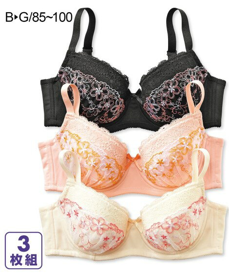 ブラジャー ワイヤー入り 大きいサイズ レディース 編みレースにお花刺しゅうを重ねた 3枚組 3枚組 G85/G90/G95/G100 ニッセン