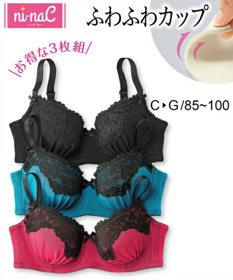 ブラジャー (G85-G100) 大きいサイズ ニーナC ブラック レース ブラジャー 3枚組 ニッセン nissen